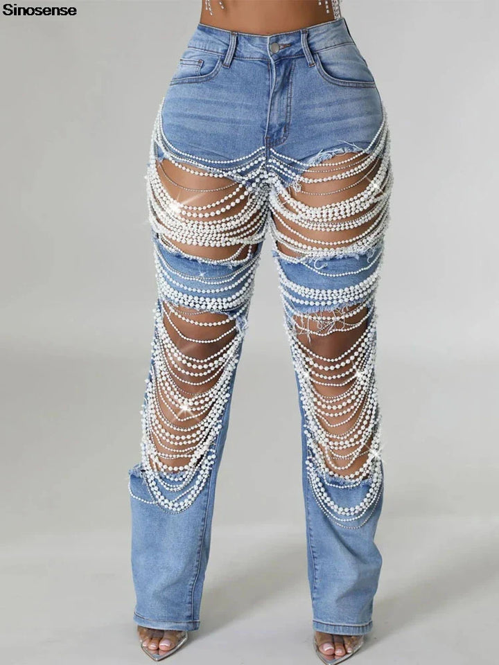 Women's Destroyed Ripped Hole Denim Pants Pearl Rhinestones Chain Distressed Slim Fit Skinny Jeans Y2K Night Club Party Jeans