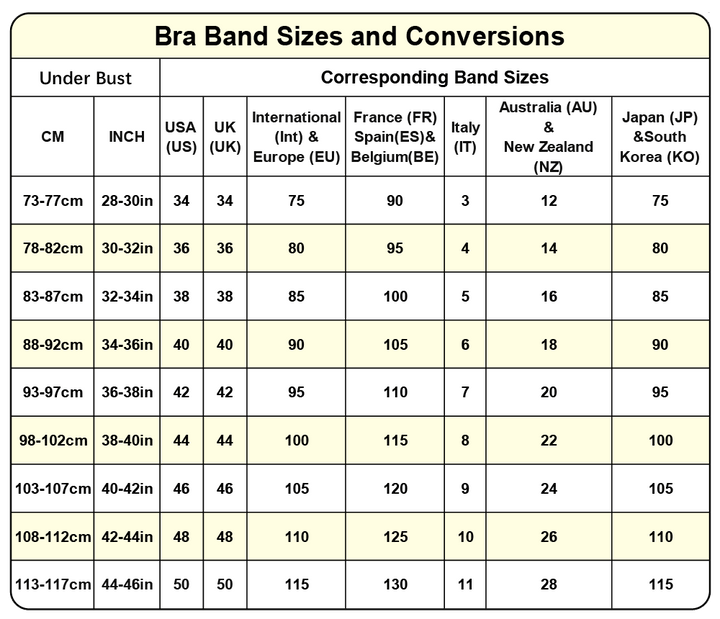 Answer: Step 1,Measure your band size Place the measuring tape around your ribcage, right underneath the band of your bra.Make sure it is pulled tight but is not uncomfortable and that the tape is level.Make a note of how many inches you are.If you land on an even number this is your band size.If you land on an odd number, you’ll want to round up or round down to the nearest even number based on your build. Step 2,Measure your bust size Place the measuring tape around the fullest part of your bust(at nipple level),making sure to hold the measuring tape snugly against you and parallel to the ground. You won’t need to pull the tape particularly tight for this measurement it just needs to sit flat.Make a note of how many inches you are.If it falls on the half-inch, just round up. That’s your bust size! Step 3,Determine Your Cup Size Minus your band size from your cup size and make a note of this value.This difference indicates your cup.Example: 37 inches (bust) – 34 inches (band) = 3 inches. That's a 34C. 0=AA , 1=A, 2=B, 3=C, 4=D, 5=DD(E),6=DDD(F), 7=G