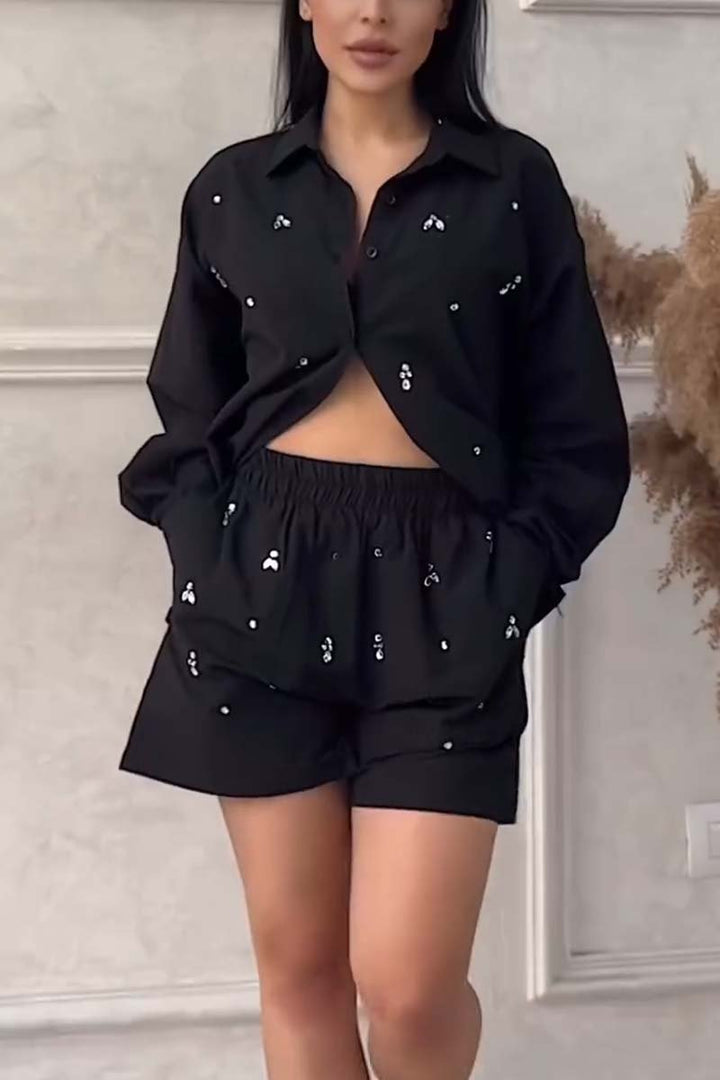 Diamond embellished long sleeved shirt and shorts two-piece set