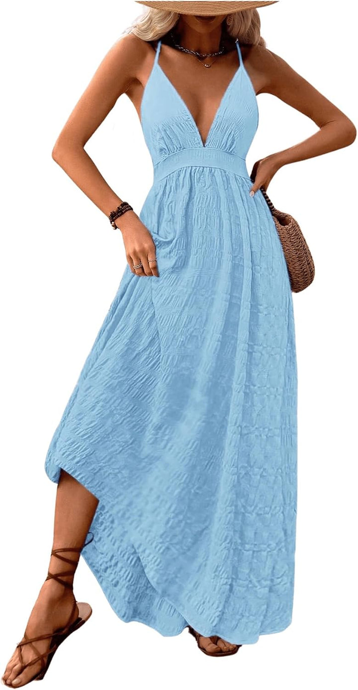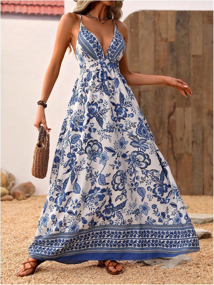 MakeMeChic Women's Boho V Neck Sleeveless Maxi Sundress Floral Print Criss Cross Backless Flare Cami Dress
