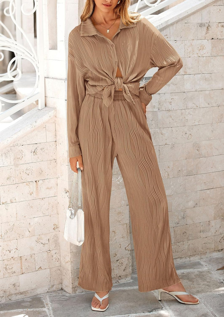 Women's 2 Piece Textured Sets Casual Button Down Shirt Wide Leg Pants Outfit Loungewear Tracksuit