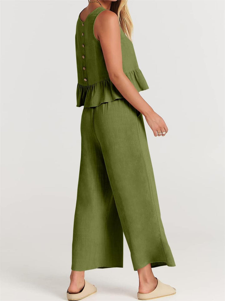 - Features - Cute Summer 2 piece outfits featured sleeveless round neck ruffle hem crop top with button down back, elastic High waist wide leg above ankle length pants with pocket.